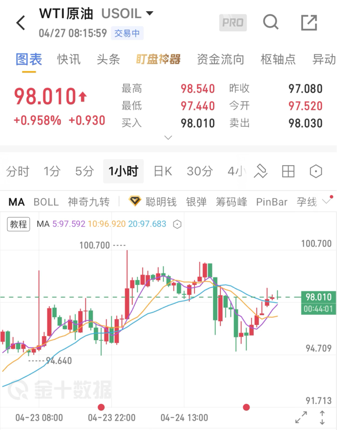 4月27日,国际原油价格快速上涨,WTI原油日内涨幅一度扩大至1%,最高报98.54美元/桶。