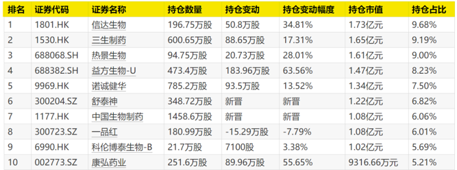 前三大重仓股为信达生物、三生制药、热景生物;舒泰神、中国生物制药“新晋”十大重仓股,持仓市值均超1亿元。