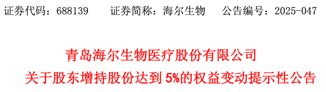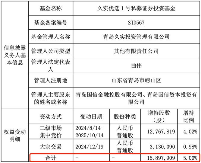 海尔生物最新发布公告称,2025年10月15日,公司收到久实投资(代表“久实优选1号”)发来的《简式权益变动报告书》,基于对公司未来发展前景的信心和对公司长期投资价值的认可,久实优选1号于2024年8月14日至2025年10月14日通过二级市场集中竞价和大宗交易方式增持公司股份1589.79万股,占公司总股本的5.00%。