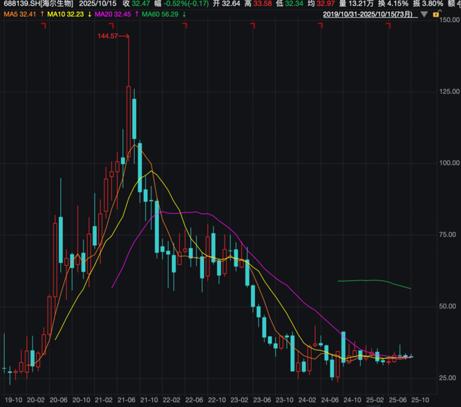 值得注意的是,海尔生物股价已经连续多年下跌,2022年、2023年、2024年和2025年以来,跌幅分别为29.83%、35.46%、12%、6.38%。