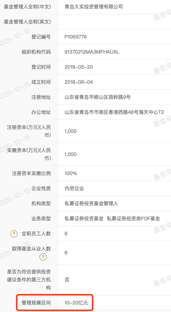 资料显示,久实投资是山东青岛本地的私募基金公司,成立于2018年6月4日,注册资本为1000万元;公司于2019年5月20日完成私募证券投资基金管理人登记,公司管理规模区间是10亿元至20亿元。