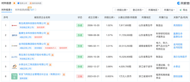 天眼查信息显示,除了投资海尔生物,久实投资还投资了高测股份、盈康生命、ST金鸿、永泰运等多家A股上市公司。