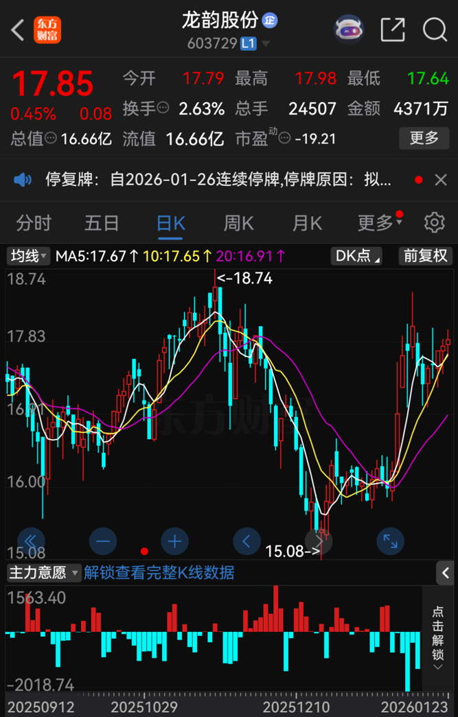 龙韵股份计划自1月26日开市起停牌。截至1月23日收盘,龙韵股份股价报17.85元/股,涨幅达0.45%,总市值为16.66亿元。