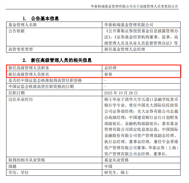 【导读】崔春加盟 华泰柏瑞官宣新任总经理