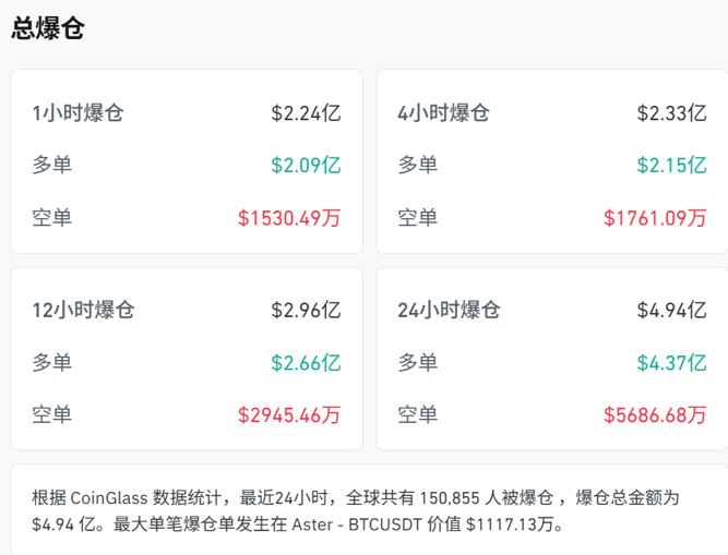 与此同时,全球市场爆仓数据迅速提升。据CoinGlass数据统计,最近24小时,全球共有150,855人被爆仓,爆仓总金额为4.94亿美元。其中多单4.37亿美元,空单5686.68万美元。