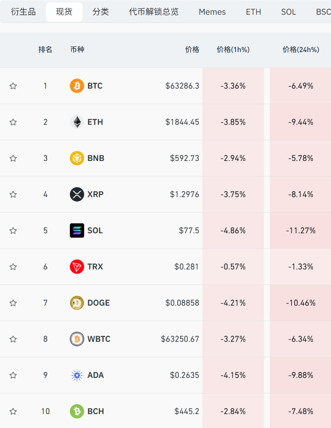 主流币种集体跳水。CoinGlass数据显示,24小时内SOL、DOGE跌超10%,ETH、ADA跌近10%,BNB、XRP、BCH等纷纷大跌。