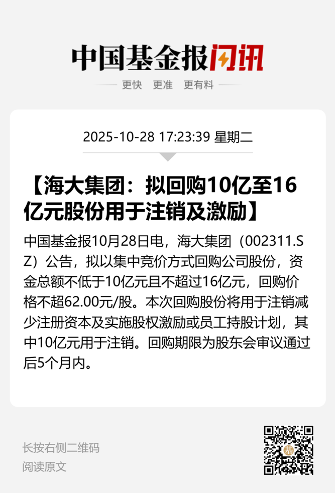 10月28日晚间,海大集团公告称,拟以自筹资金回购10亿元至16亿元A股股份,回购价格不超过62.00元/股。其中10亿元回购股份将用于注销并减少注册资本,超过10亿元的回购股份将用于实施股权激励计划及/或员工持股计划。