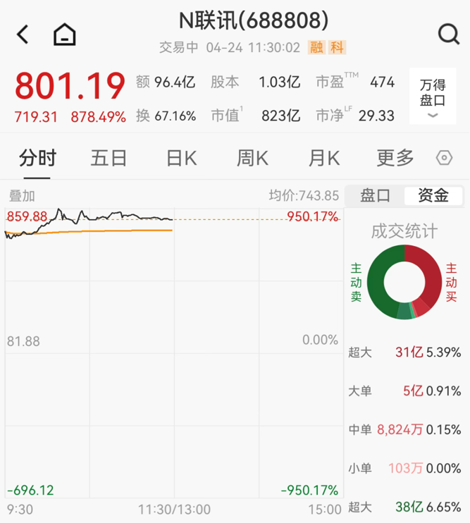 今日,光芯片测试设备厂商联讯仪器正式登陆科创板,上市首日开盘价报736.92元/股;截至午盘,涨幅高达878.49%,报801.19元/股。