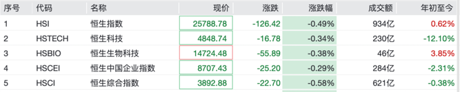 港股市场同样集体下挫。截至发稿,恒生指数跌0.49%,恒生科技指数跌0.34%,恒生中国企业指数跌0.29%,恒生生物科技指数跌0.38%。个股方面,比亚迪股份跌超3%,腾讯控股、网易、美团等均跌超1%。
