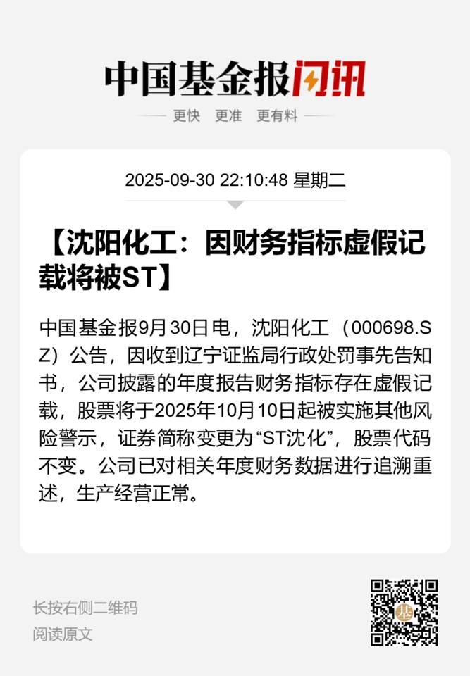 沈阳化工公告称,结合公司本次收到的《行政处罚事先告知书》认定的情况,公司触及《深圳证券交易所股票上市规则(2025年修订)》第9.8.1条规定的其他风险警示情形。