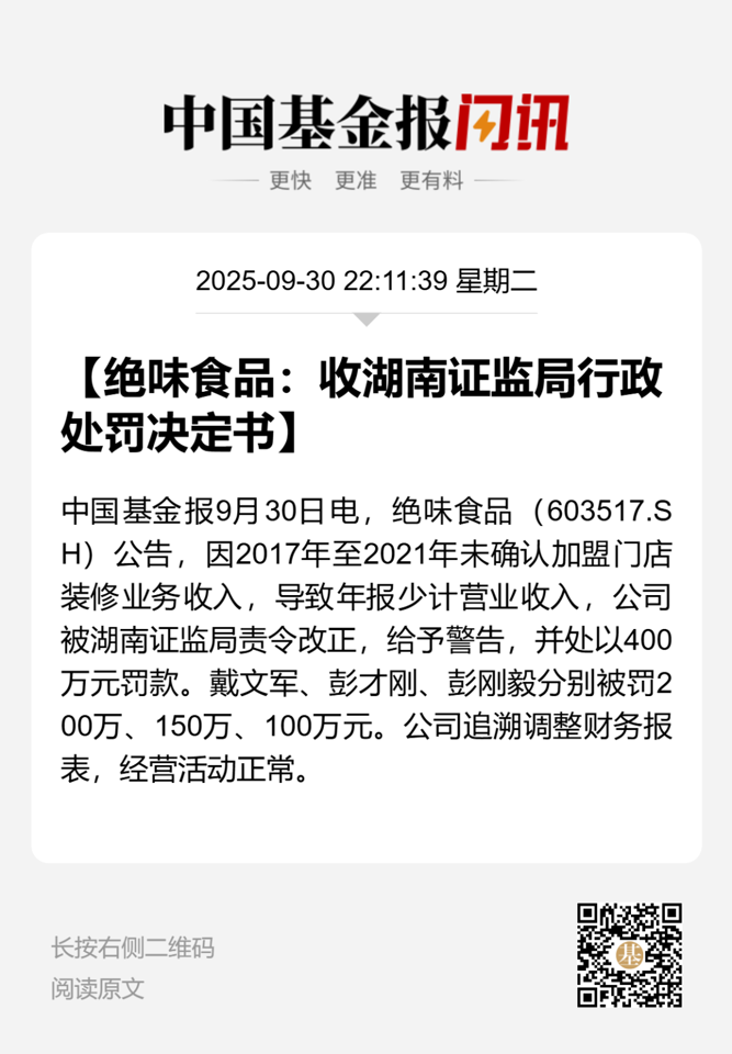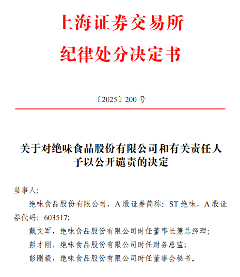 同日晚间,上交所下发的《关于对绝味食品股份有限公司和有关责任人予以公开谴责的决定》显示,根据湖南证监局下发《行政处罚决定书》查明的相关事实,上交所决定对ST绝味及其时任董事长兼总经理戴文军、时任财务总监彭才刚、时任董事会秘书彭刚毅予以公开谴责。