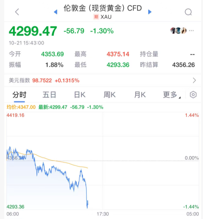 另外,国际贵金属价格跳水,现货黄金失守4300美元关口,日内跌幅扩大至1.3%,现货白银跌近3%。