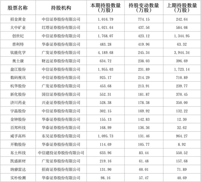 从持股数量变化来看,券商加仓力度较大的标的主要集中在有色金属、资源、非银金融等板块。
