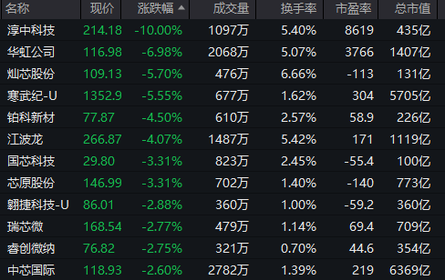 ASIC芯片指数走低,淳中科技跌停,华虹公司跌近7%,寒武纪、江波龙、中芯国际等跟跌。