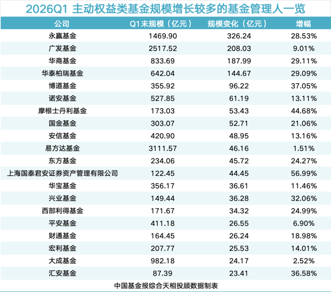 具体来看,永赢基金规模增加326.24亿元,增幅为28.53%;广发基金规模增加208.03亿元,增幅为9.01%;华商基金规模增加187.99亿元,增幅为29.11%。此外,东财基金、安联基金、路博迈基金等多家公司主动权益类基金规模实现翻倍增长。