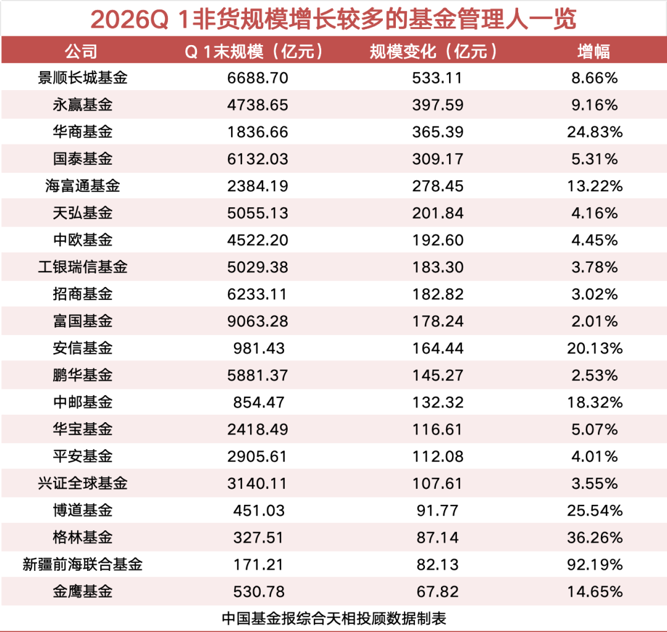 规模变化方面,今年一季度,共有67家基金管理人非货规模实现增长,其中16家增超百亿元。