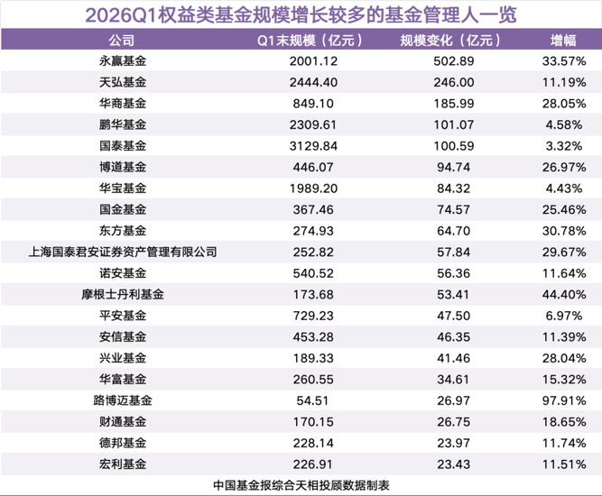 具体来看,永赢基金增加502.89亿元,增幅达33.57%;天弘基金增加246亿元,增幅为11.19%;华商基金增加185.99亿元,增幅为28.05%。此外,明亚基金、安联基金、施罗德基金、红土创新基金旗下权益基金规模均实现翻倍增长。