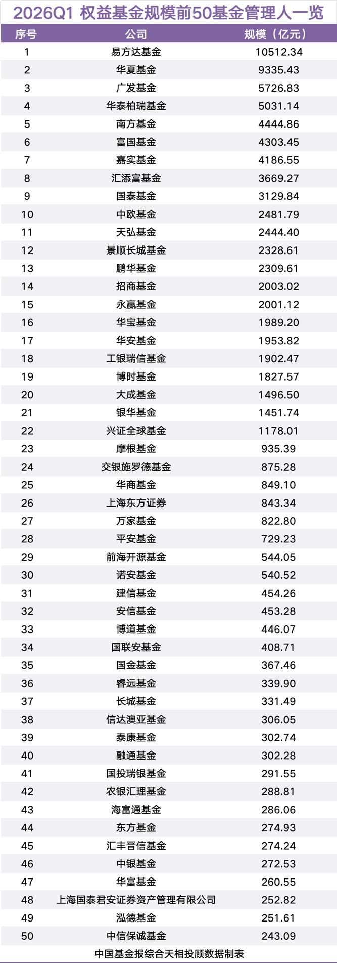 权益类基金(含QDII)规模方面,截至今年一季度末,易方达基金以1.05万亿元规模位列第一;华夏基金以9335.43亿元排在第二位;广发基金、华泰柏瑞基金规模均超5000亿元,分别排在第三、第四位;南方基金、富国基金、嘉实基金分别排在第五、第六、第七位,规模均超4000亿元;汇添富基金、国泰基金、中欧基金亦跻身前十。
