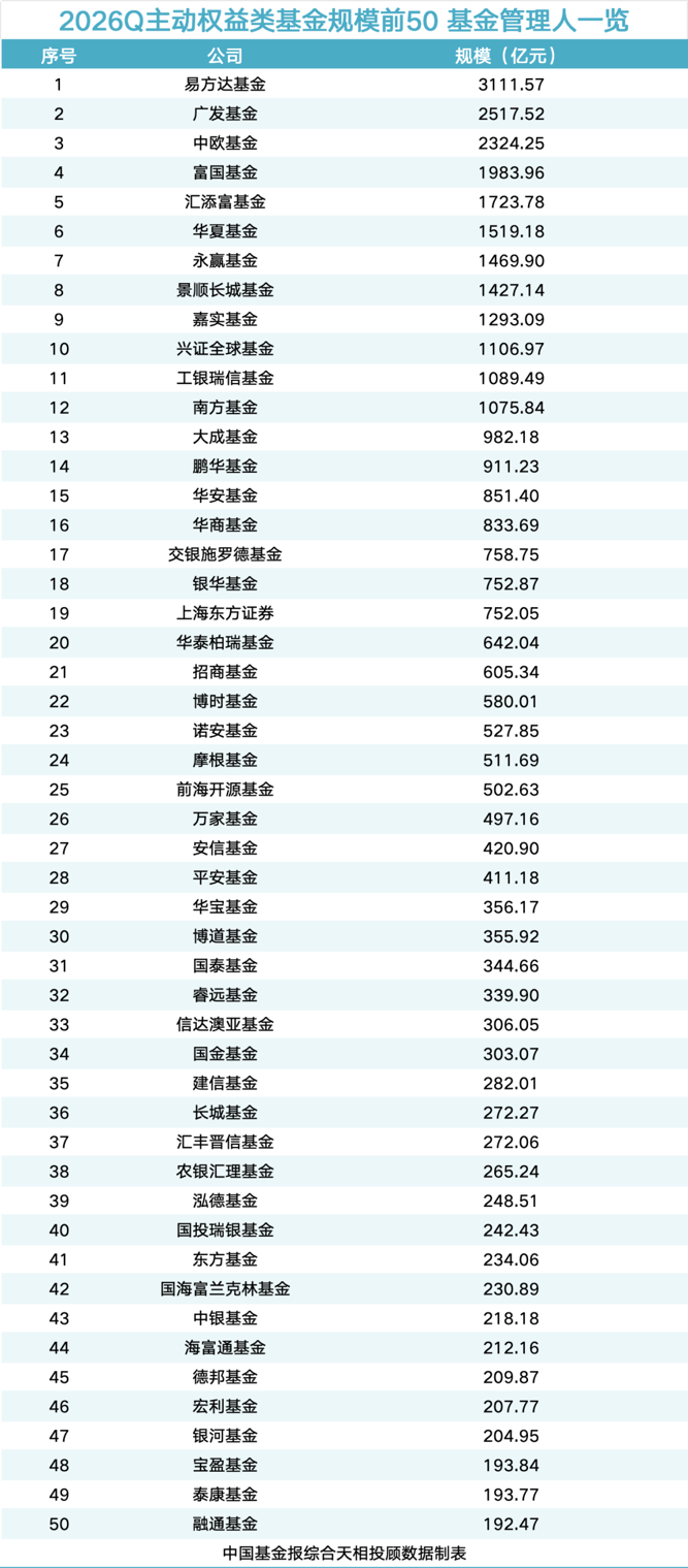 主动权益类基金(含QDII)规模方面,截至今年一季度末,易方达基金、广发基金、中欧基金位列前三,规模分别为3111.57亿元、2517.52亿元、2324.25亿元。