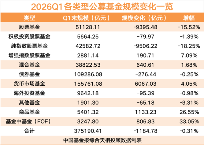天相投顾数据显示,截至一季度末,公募基金管理规模(含估算基金)达37.52万亿元,与去年末相比减少1184.78亿元,降幅为0.31%。