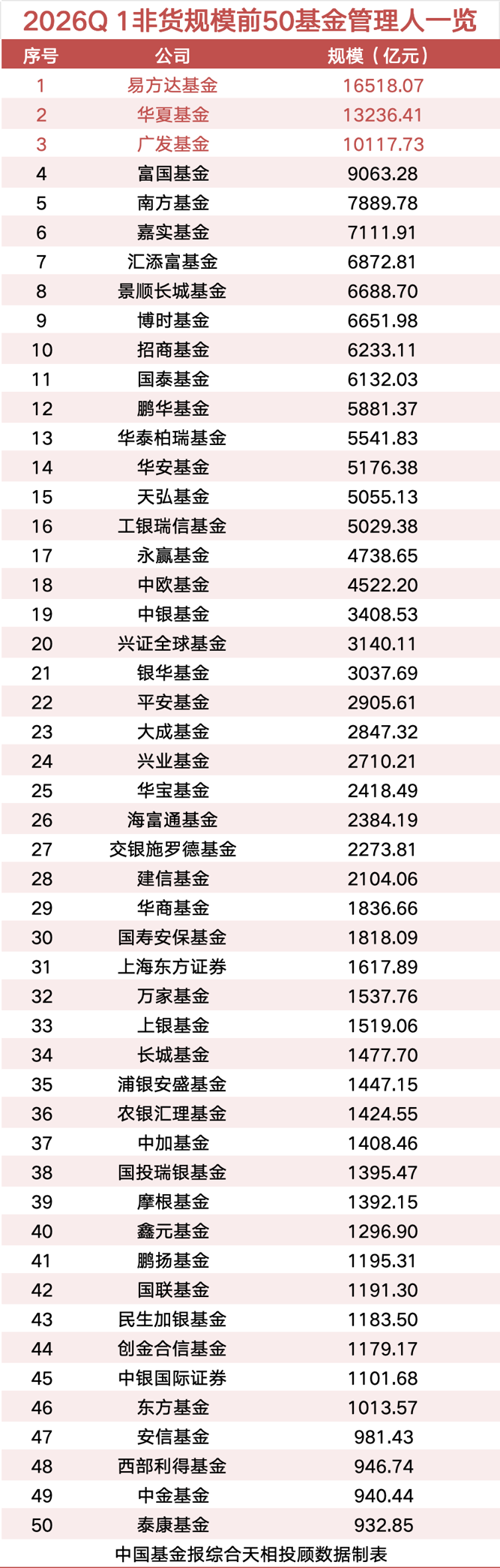 非货规模排名方面,易方达基金以1.65万亿元管理规模位居行业第一,华夏基金以1.32万亿元名列第二,广发基金以1.01万亿元位居第三。