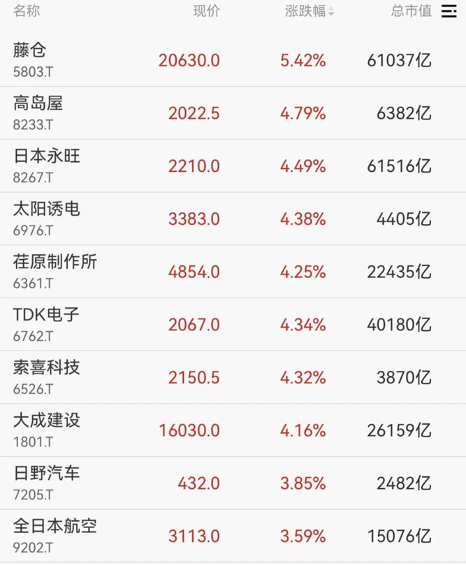 个股方面,藤仓、高岛屋、日本永旺等涨幅居前。