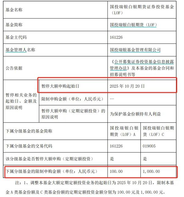 10月18日,国投瑞银基金发布公告称,为保护基金份额持有人利益,调整旗下国投瑞银白银期货(LOF)大额申购(含定期定额投资)业务。具体而言,自10月20日起,限制该基金A类基金份额及C类基金份额的单日申购、定投金额为100元及1000元。