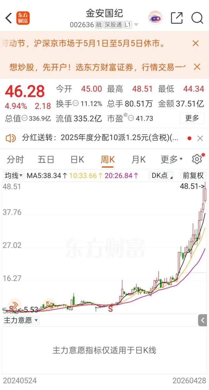 截至4月28日收盘,金安国纪股价报46.28元/股,上涨4.94%,总市值达336.9亿元。