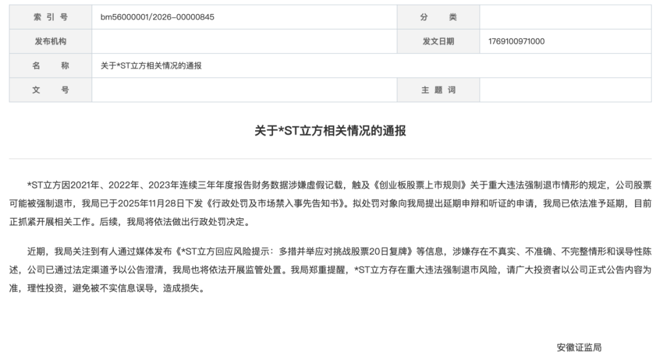 1月23日,安徽证监局发布通报称,*ST立方因2021年、2022年、2023年连续三年年度报告财务数据涉嫌虚假记载,触及《创业板股票上市规则》关于重大违法强制退市情形的规定,公司股票可能被强制退市。