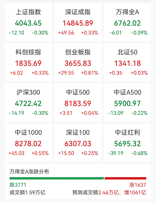 个股跌多涨少。全市场1637只个股上涨,57只个股涨停,3771只个股下跌。
