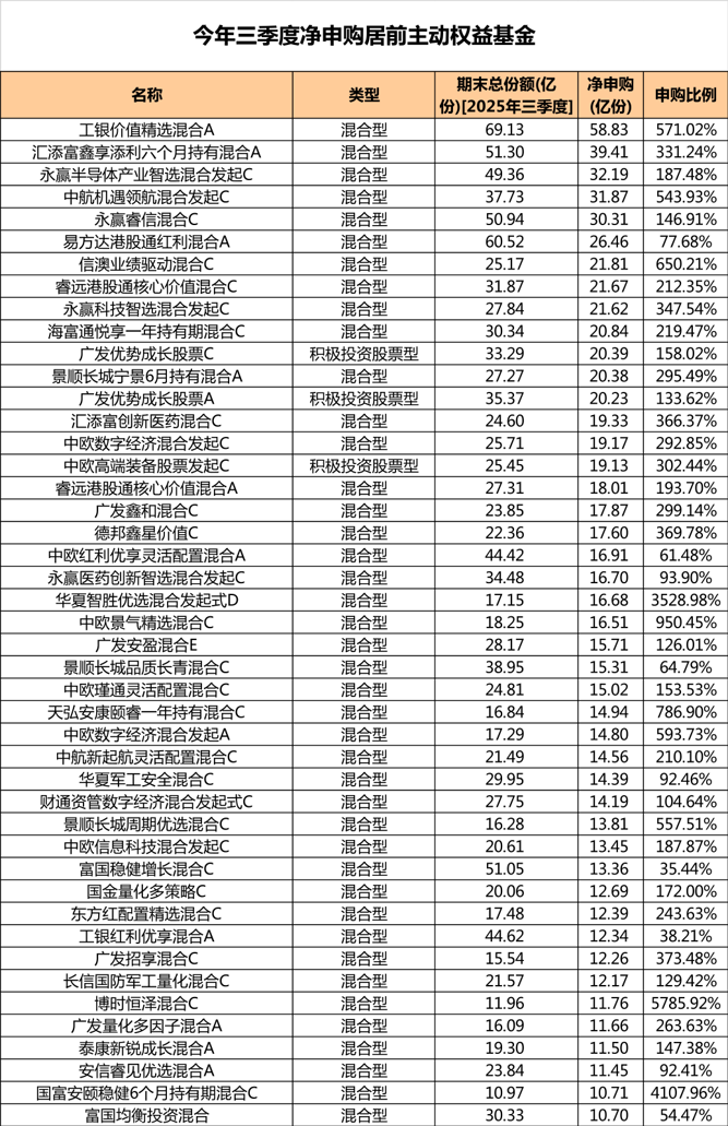 值得一提的是,今年三季度,仍有业绩优异的主动权益产品受到投资者追捧,出现资金明显净流入,其间45只基金获净申购超10亿份,与上季度相比增逾两倍。