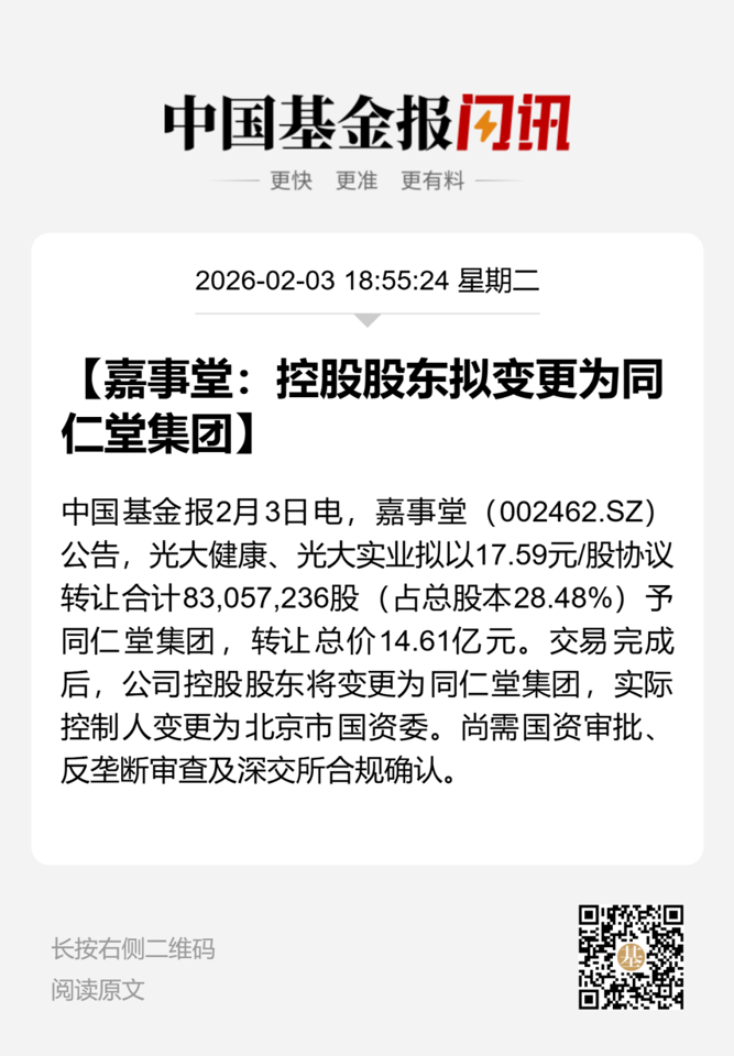 自1月28日起停牌的嘉事堂2月3日晚公告,2月2日,公司股东中国光大医疗健康产业有限公司(以下简称光大健康)、中国光大实业(集团)有限责任公司(以下简称光大实业)与中国北京同仁堂(集团)有限责任公司(以下简称同仁堂集团)签署了《股份转让协议》,光大健康、光大实业拟通过协议转让方式将其合计持有的公司股份总数的28.48%转让给同仁堂集团;转让价格为17.59元/股,转让价款总计为14.61亿元。