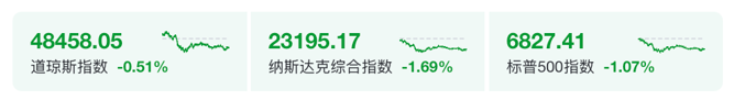 昨夜今晨,美股三大股指全线收跌。截至收盘,道琼斯工业平均指数跌0.51%,报48458.05点;标普500指数跌1.07%,报6827.41点;纳斯达克综合指数跌1.69%,报23195.17点,纳斯达克100指数跌近2%。
