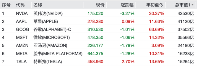 万得美国科技七巨头指数跌1.12%。其中,英伟达跌超3%,亚马逊跌近2%,谷歌、微软、脸书跌超1%;特斯拉涨近3%,苹果涨0.09%。