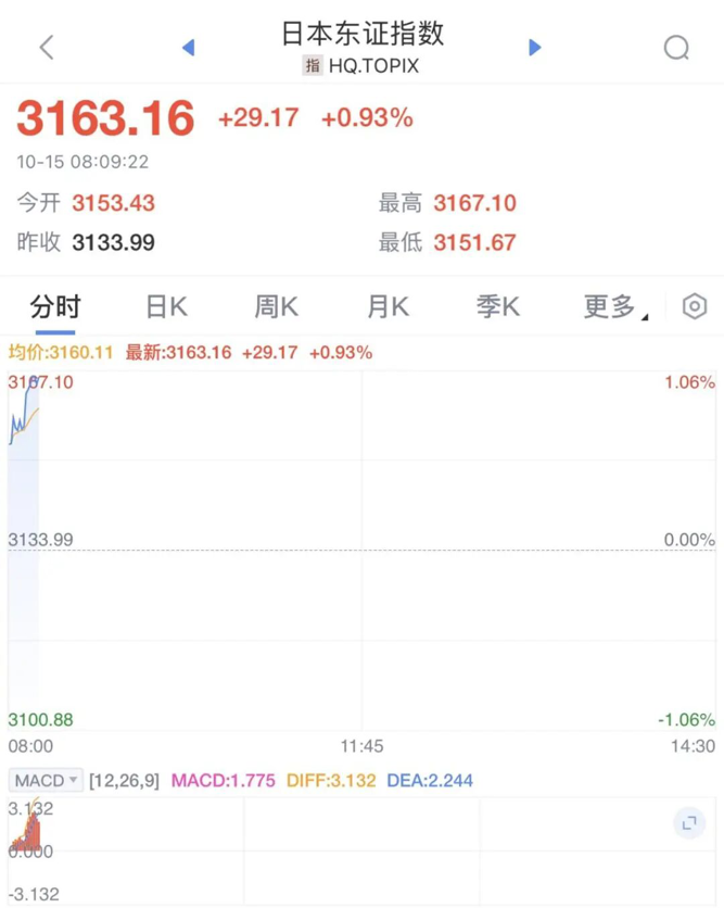 10月15日,日本股市高开高走,日本东证指数一度涨超1%。