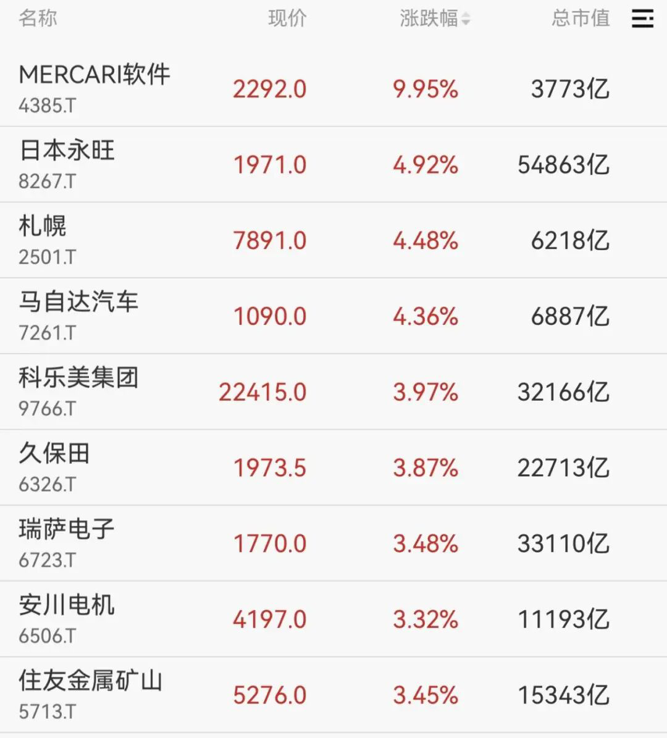 权重股方面,日本永旺、马自达汽车、科乐美集团等涨幅居前。