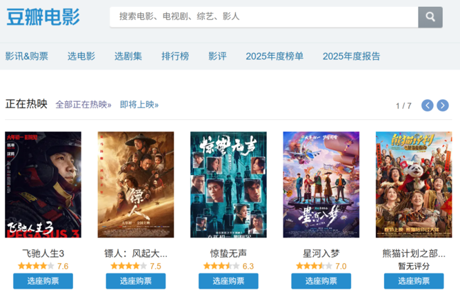 值得关注的是,于大年初一上映的6部新片中,近期已有4部在豆瓣开分。其中,《飞驰人生3》获评7.6分,《镖人:风起大漠》获评7.5分,《星河入梦》获评7.0分,《惊蛰无声》获评6.3分。