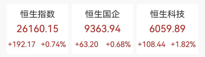 10月24日,香港三大股指全线上涨。香港恒生指数涨0.74%,报26160.15点,本周涨3.62%;恒生科技指数涨1.82%,报6059.89点,本周涨5.2%;恒生中国企业指数涨0.68%,报9363.94点,本周涨3.91%。南向资金净买入32.14亿港元。