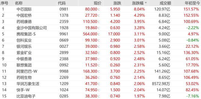 恒生指数成份股中,61只上涨、22只下跌。中芯国际涨8.04%,中国宏桥涨4.29%,药明康德上涨3.95%,领涨蓝筹。