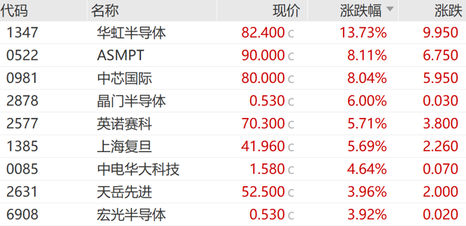华虹半导体涨13.73%,ASMPT涨8.11%,中芯国际涨8.04%,领涨万得半导体行业指数成份股。
