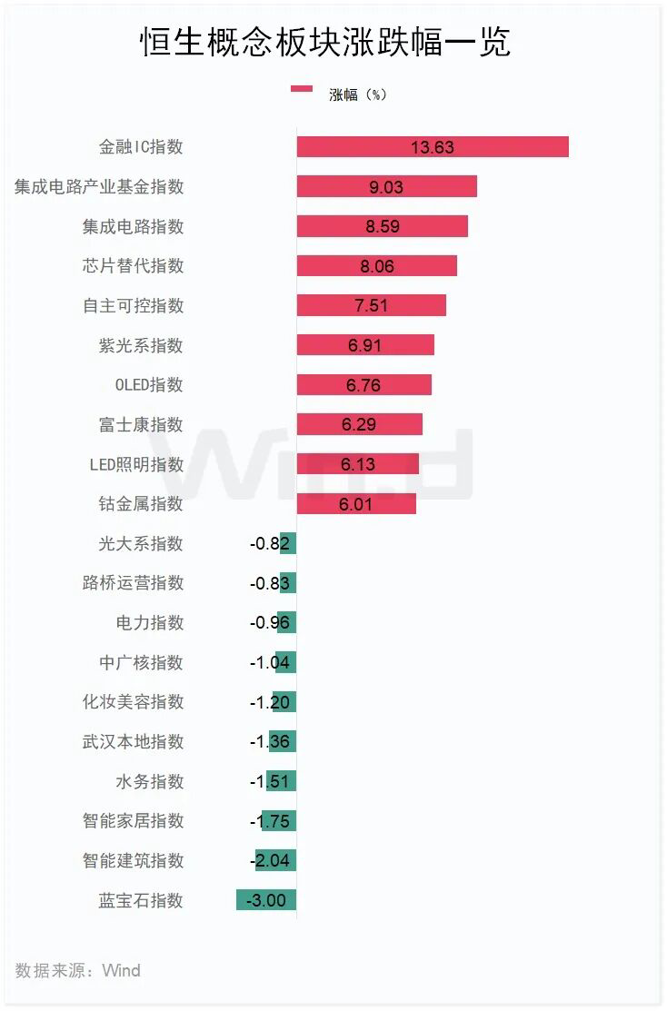 从盘面来看,Wind概念板块多数上涨,金融IC指数涨13.63%,集成电路产业基金指数涨9.03%,集成电路指数涨8.59%。跌幅方面,蓝宝石指数领跌3%,智能建筑指数跌2.04%,智能家居指数跌1.75%。