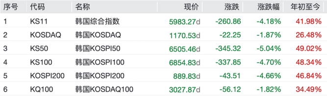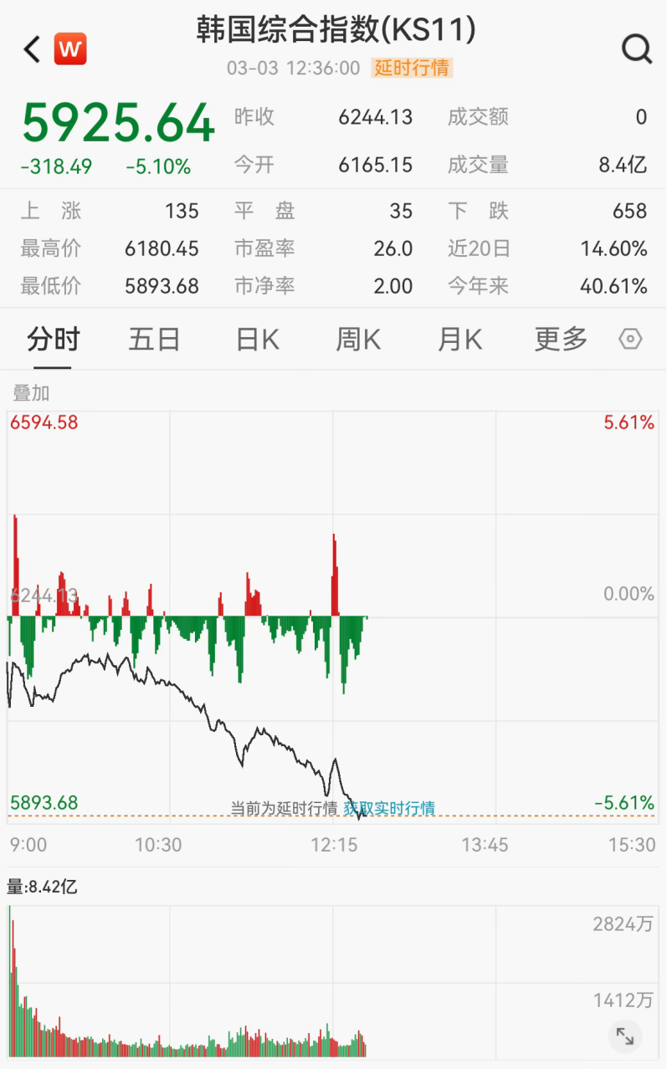 截至发稿,韩国综合指数跌幅达5.1%,报5925.64点。此前最低跌至5893.68点。