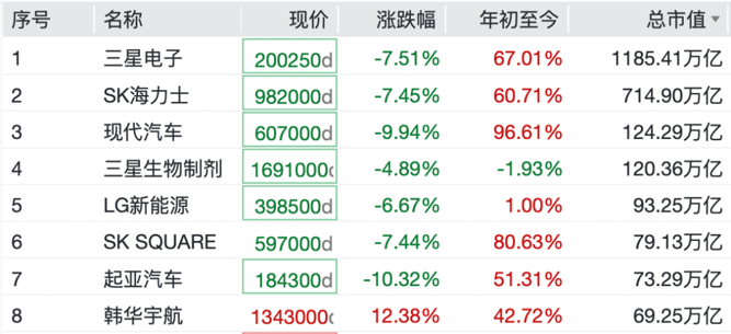 韩国核心股重挫。三星电子、SK海力士跌超7%,现代汽车跌9.94%,三星生物制剂跌近5%。
