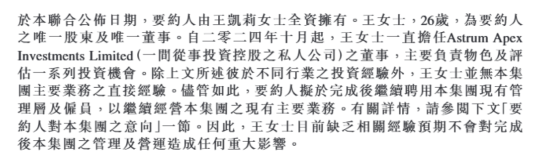 王凯莉,现年26岁,为万疆资本的唯一股东及唯一董事。自2024年10月起,王凯莉一直担任Astrum Apex Investments Limited(一间从事投资控股之私人公司)的董事,主要负责物色及评估投资机会。