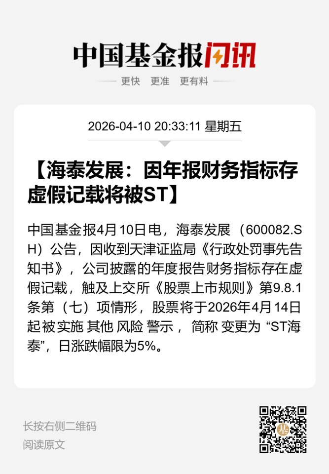 4月10日晚间,海泰发展发布公告称,根据天津证监局下发的《行政处罚事先告知书》载明事项,公司自4月14日开市起被实施其他风险警示,证券简称变为ST海泰,股票价格的日涨跌幅限制为5%。