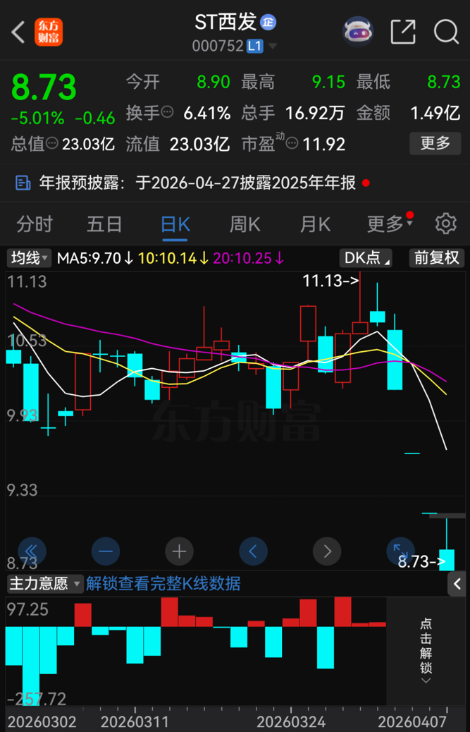 ST西发披露罗希失联公告以来,股价连续两个交易日跌停(4月3日、4月7日)。截至4月7日收盘,ST西发股价报8.73元/股,跌幅达5.01%,总市值为23.03亿元。