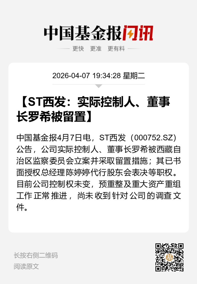 ST西发公告称,目前,公司控制权未发生变化,其他董监高正常履职,日常经营正常。罗希被留置的事项,暂未对公司董事会运作及经营产生重大影响。