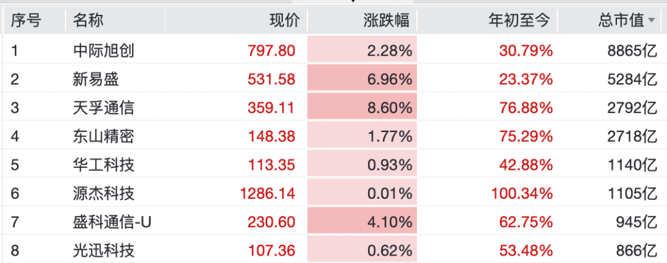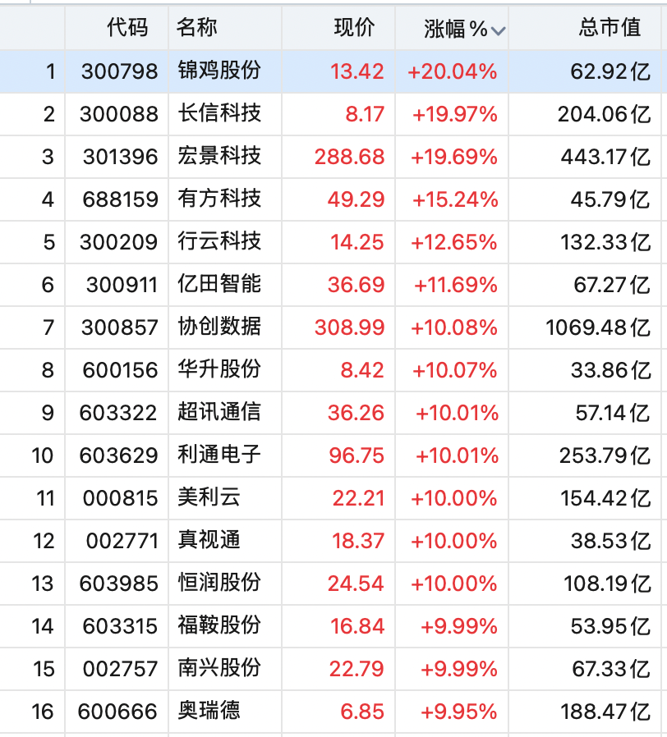 上午,算力租赁概念股强势拉升,个股掀起“涨停潮”,其中,锦鸡股份、长信科技录得20cm涨停,协创数据、超讯通信、华升股份、利通电子、美利云、真视通、恒润股份、南兴股份均录得10cm涨停。此外,工业富联涨超3%,寒武纪涨超2%。消息面上,算力涨价潮席卷全球,海内外巨头又开始了新一轮调价。4月15日,阿里云发布公告称,将对部分MU(Model Unit)模型单元的服务价格进行适度调整。影响产品为大模型服务平台百炼,上调幅度为2%—7%不等。另外,Anthropic调整了旗下企业级产品Claude Enterprise订阅模式,从每月每个用户最高200美元的固定费用,调整为按照实际算力消耗收费。CPO板块强势拉升,“易中天”大涨:中际旭创涨2.28%,新易盛涨近7%,天孚通信涨8.6%。