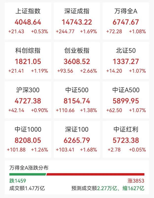 大家好,今天是周四,一起来关注最新的A股市场资讯及消息。4月16日上午,A股三大指数集体走强。截至午间收盘,沪指涨0.53%,深证成指涨1.69%,创业板指涨2.66%,科创综指涨1.19%。个股涨多跌少,全市场共3853只个股上涨,59只个股涨停,1459只个股下跌。盘面上,新能源板块集体爆发,“宁王”股价再创新高;科技板块整体回暖,CPO板块拉涨,存储芯片概念股短线拉升,大为股份涨停;创新药概念股则出现回调,航运、银行等板块走弱。港股市场同样集体上涨。截至发稿,恒生指数涨1.13%,恒生科技指数涨2.56%,恒生生物科技指数涨0.6%。个股方面,阿里巴巴、比亚迪股份均涨近4%,腾讯控股、美团均涨超2%,网易、快手、小米集团、百度集团、京东集团等纷纷上涨。来看详情——