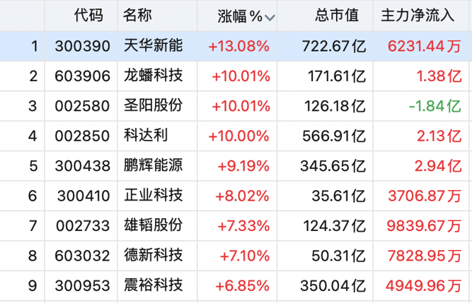 上午,新能源板块集体爆发。宁德时代股价最高至460元/股,创历史新高;截至午间收盘,报450.14元/股,最新市值为20833亿元。电池板块拉升走高,龙蟠科技、圣阳股份、科达利纷纷涨停,天华新能涨超13%,鹏辉能源、正业科技、雄韬股份、德新科技等均涨超7%。消息面上,4月15日晚间,宁德时代发布今年一季度报告。报告期内,公司实现营业收入1291.31亿元,同比增长52.45%;归属于上市公司股东的净利润为207.38亿元,同比增长48.52%。锂矿板块领涨市场,盛新锂能大涨7.74%,天齐锂业涨4.53%,赣锋锂业涨3.54%,永杉锂业涨6.39%,融捷股份涨超5%。消息面上,受国内整改停产叠加海外进口受限等因素影响,碳酸锂供应短期面临挤压。碳酸锂期货主力合约走强,4月15日盘中一度突破17万元/吨。此外,盐湖股份发布2026年一季度业绩快报。财报显示,今年一季度公司实现营收64.32亿元,同比增长94.89%。算力租赁概念股涨势扩大